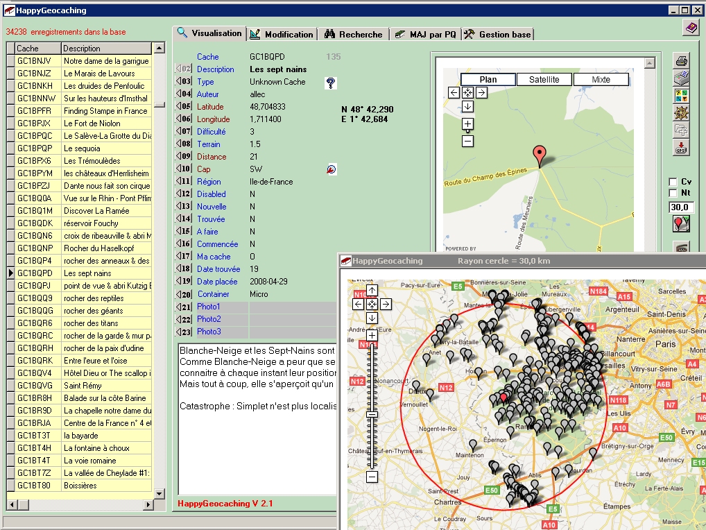 HappyGeocaching is an application functioning under Windows, to manage research of caches (geocaching).